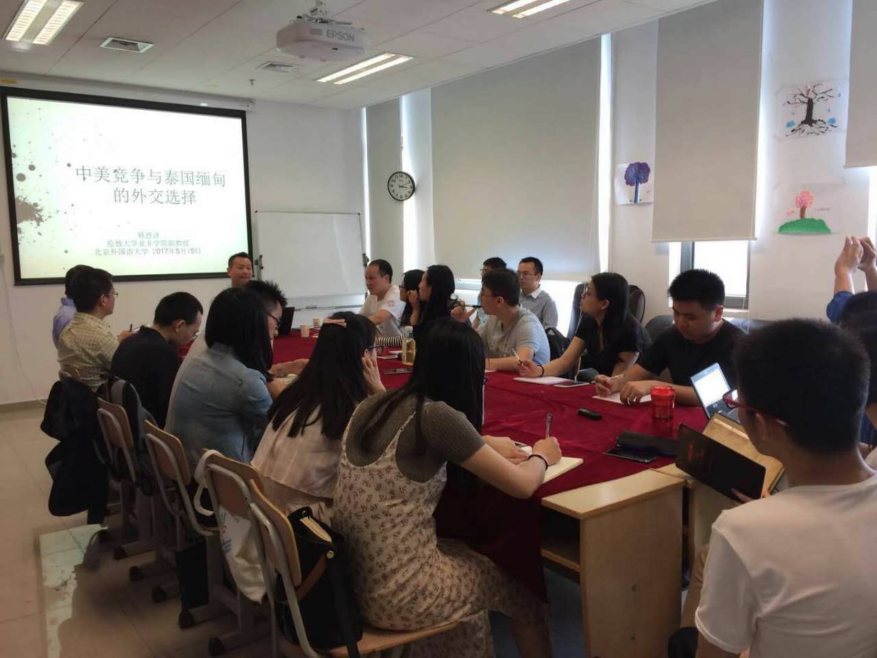 2017年5月15日下午3点至5点,北外国关学院在西院综合楼1151会议室举办了北外国关前沿沙龙第十六期活动,活动主题为“中美竞争与泰国、缅甸的外交选择”。本次活动邀请的嘉宾为伦敦大学亚非学院(SOAS,University of London)政治和国际关系学系副教授韩恩泽,尹继武教授主持,张效民副教授和史泽华副教授分别担任评议人,来自356体育在线官网和其他高校及研究机构的众多学者和同学也参与了讨论。