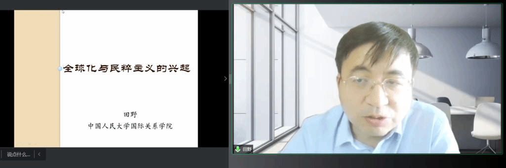 413日,中国人民大学365best体育亚洲官网教授、比较国际政治经济研究所所长,教育部青年长江学者田野教授受邀至356体育在线官网“国关讲堂”,为众师生带来一场题为“全球化与民粹主义”的学术报告。报告会以视频会议的方式举行,由我院李永成教授主持、校内外二百七十余位师生共同参与。