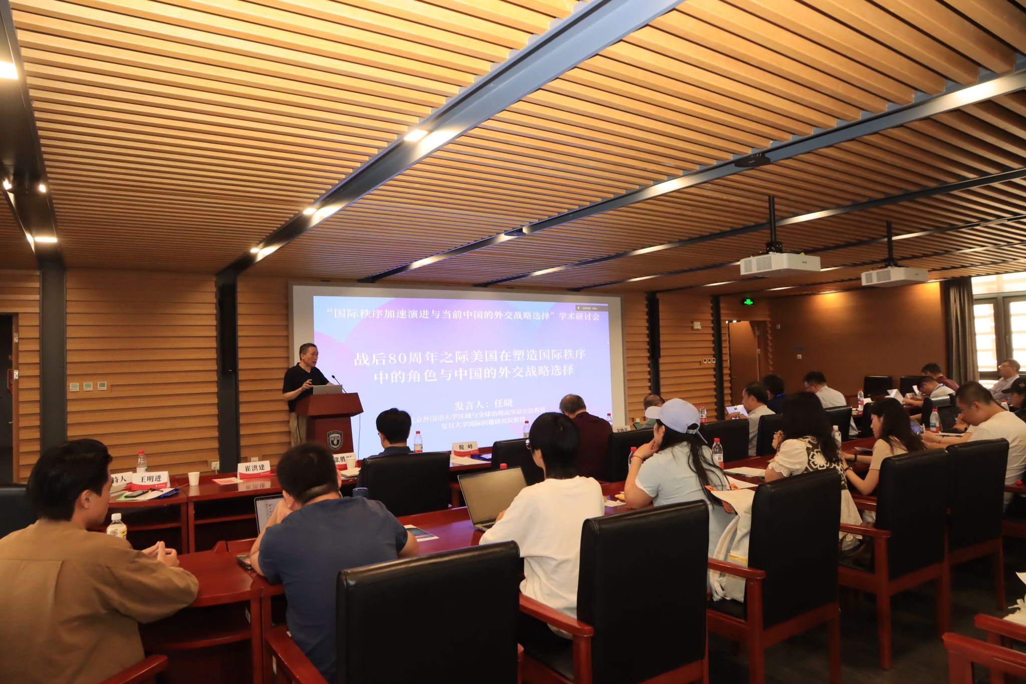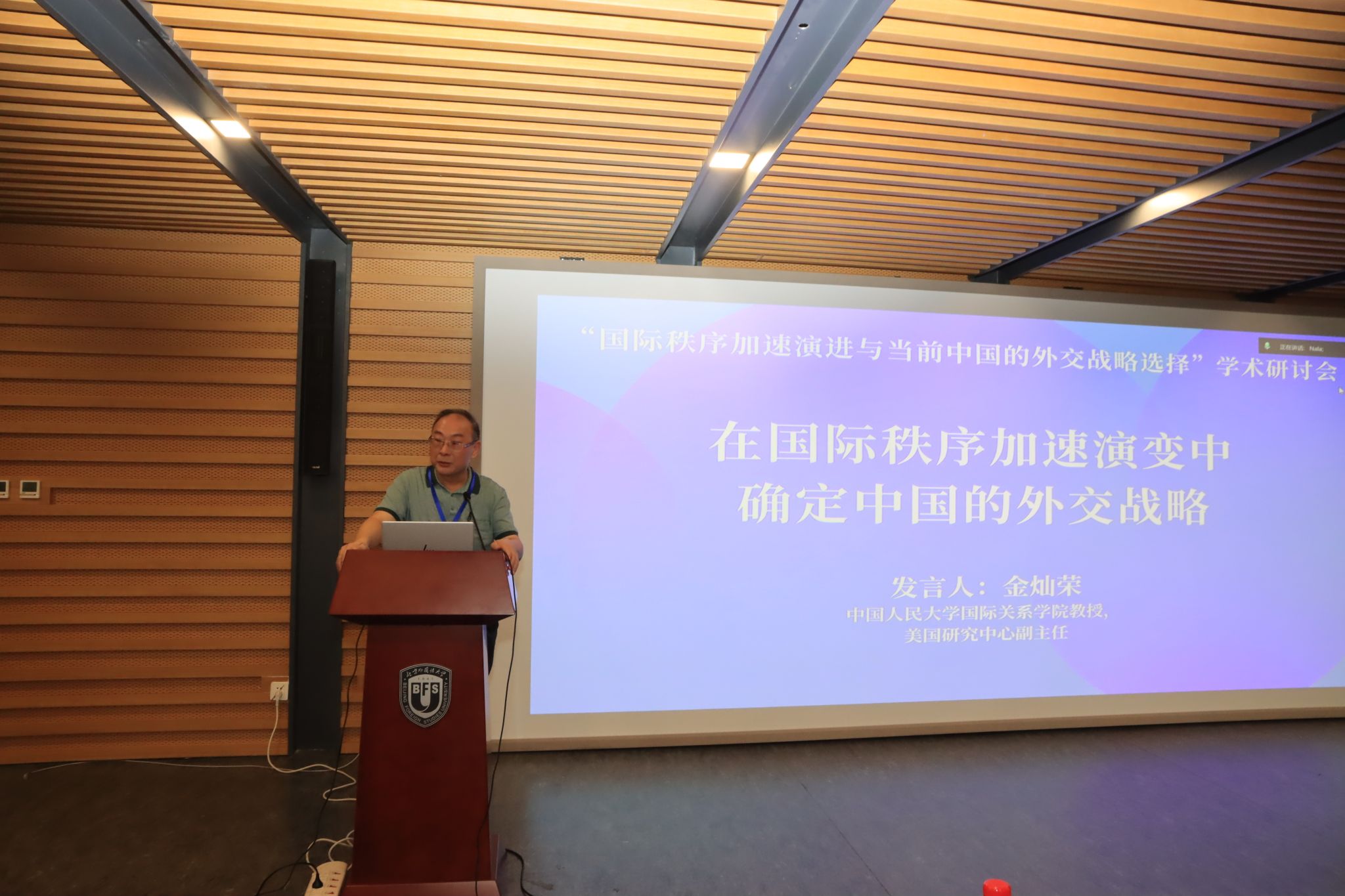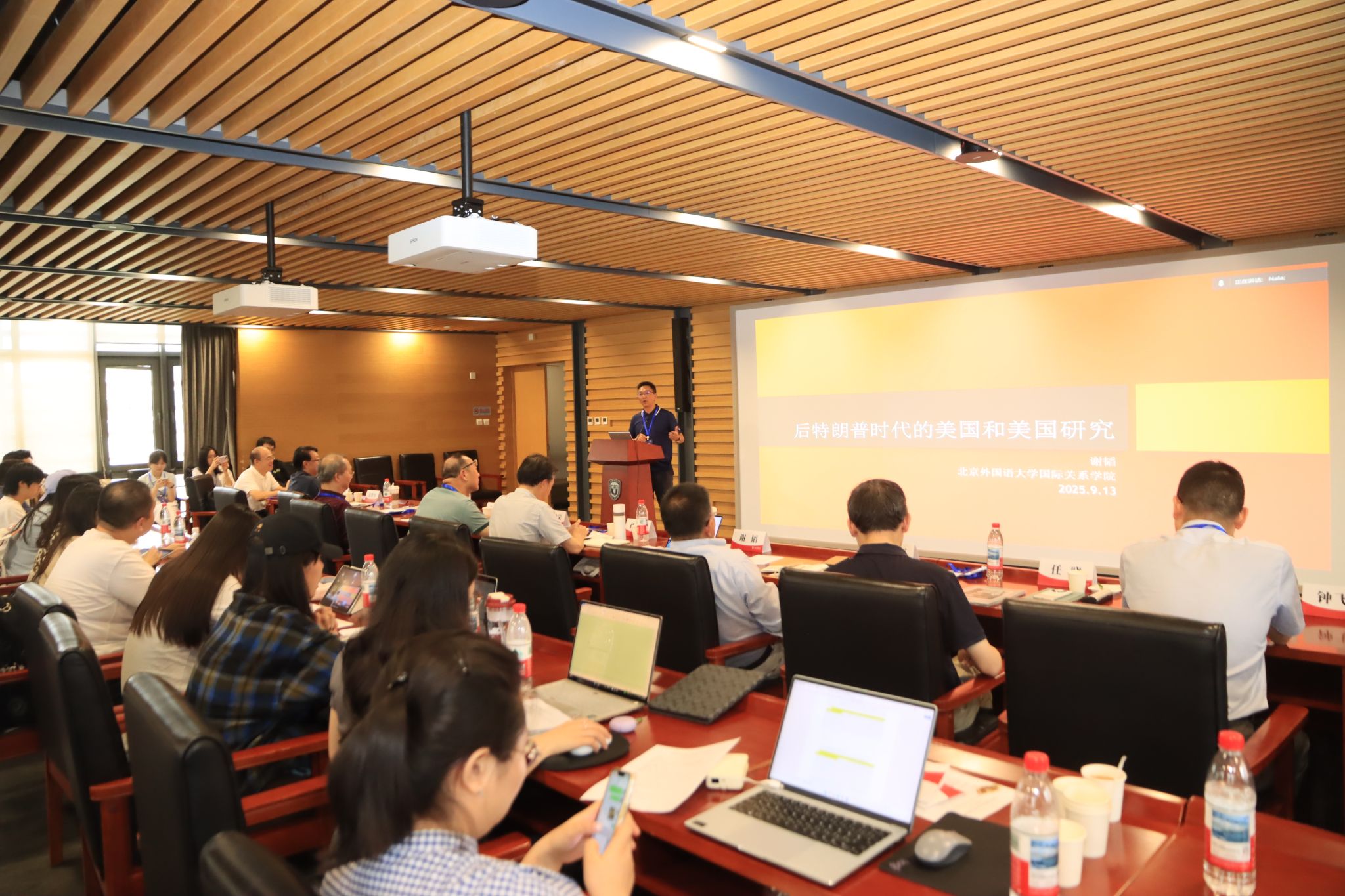 本次研讨会的主题研讨分为三个时段进行。第一时段由北外365best体育亚洲官网院长谢韬教授主持。南京大学365best体育亚洲官网院长朱锋教授分析了当前国际秩序变革的新特点与新态势;北京大学国际战略研究院院长于铁军教授围绕二战后国际秩序演进做了系统性论述;清华大学战略与安全研究中心主任达巍教授结合与访美交流的感知分析了当前中美关系与中国的对美战略;中国人民大学365best体育亚洲官网外交学系主任刁大明教授解析特朗普2.0的新变化与近期中美关系走向;北外科研处处长,中国外语与教育研究中心张天伟教授就国际语言秩序的演变及其与国际体系的相互影响展开主旨发言。