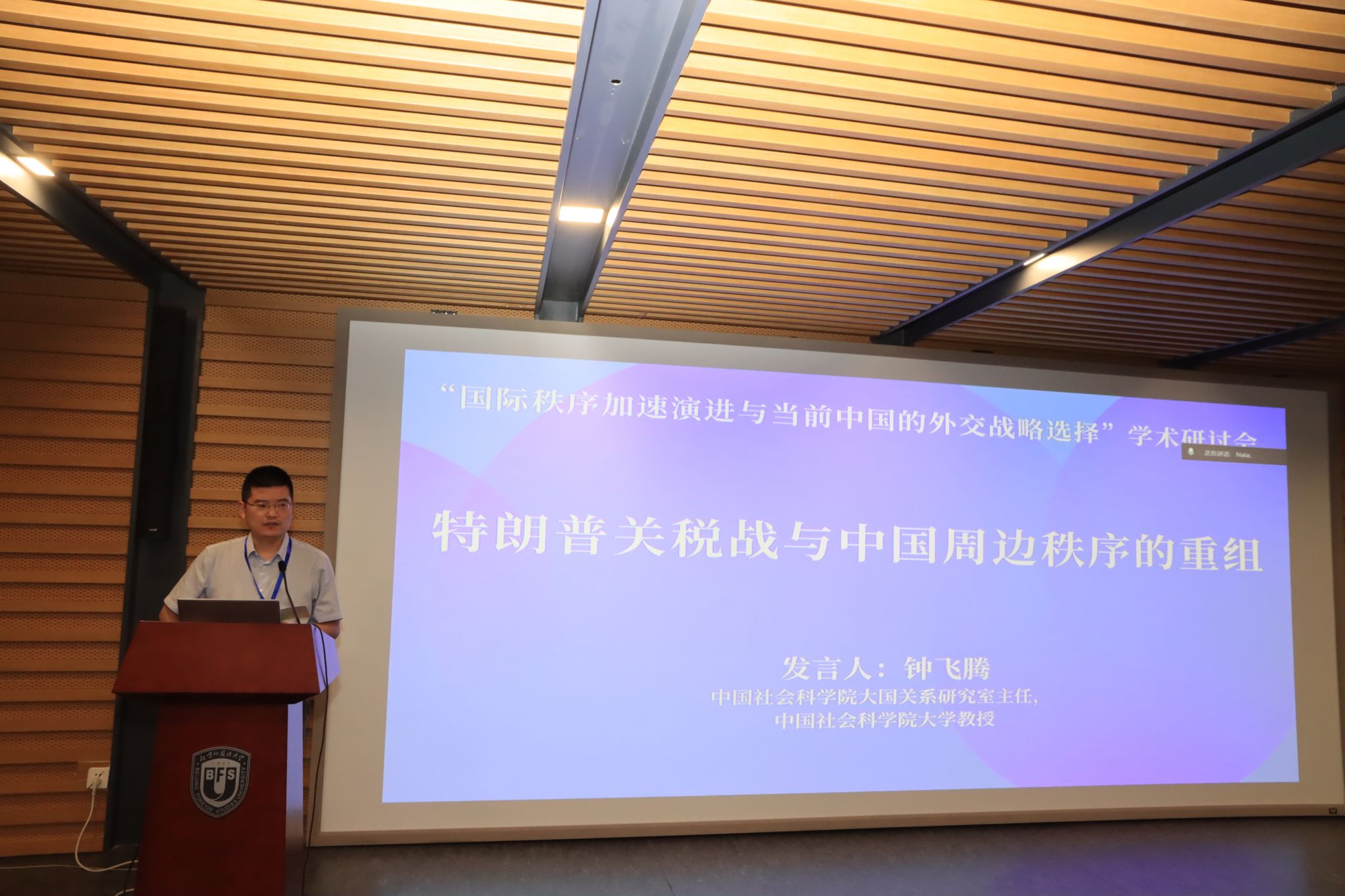 主题研讨第三时段由北外365best体育亚洲官网副院长张颖教授主持。中国社会科学院美国研究所所长倪峰教授深入分析特朗普政府第二任期执政的特点;中国社会科学院大国关系研究室主任钟飞腾教授剖析了特朗普关税战与中国周边秩序的重组;外交学院特聘教授张胜军围绕“百年变局下的国际体系转型与国际秩序重构”发言。