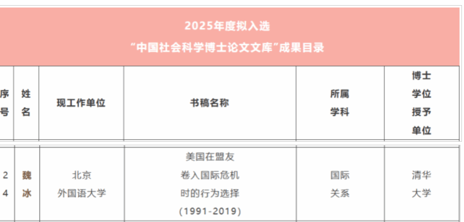 近期,我院青年教师杨双梅、夏方波申报的项目“东南亚政党政治‘家族化’与家族政治‘政党化’的逻辑、影响及中国对策研究”等两项课题喜获国家社科基金青年项目立项。青年教师魏冰的博士论文《美国在盟友卷入国际危机时的行为选择(1991-2019)》成功入选中国社会科学出版社2025年度“中国社会科学博士论文文库”,来自全国高校、研究院所的102部博士论文参评,最终评选出31部拟入选2025年度“中国社会科学博士论文文库”。青年教师贾力楠的《从比较历史政治视角反思民主和平论》和释启鹏副教授的《“众”不敌“寡”:自由主义民主缘何必然衰退》刊载在2025年第4期的《政治学研究》上。这是我院历史上首次两位教师在《政治学研究》同一期发表论文,充分展现出近年来365best体育亚洲官网在推进政治学学科发展、助力青年学者成长成才方面取得的重大成绩。《政治学研究》是中国社会科学院政治学研究所主办的学术期刊,入选CSSCI核心期和AMI顶级期刊,复合影响因子8.494,是政治学领域最具权威性的刊物。