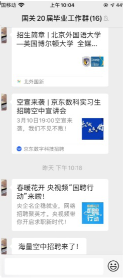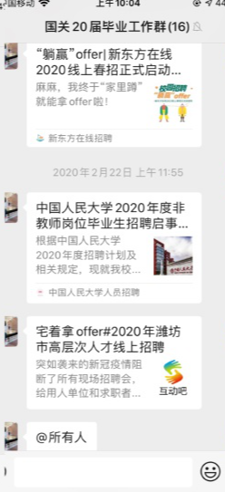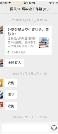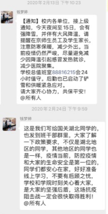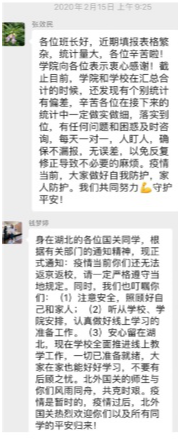 学院疫情防控小组为目前身处湖北的同学建立了联络微信群,主动了解大家的身体状况,点对点电话联络,关心同学们的身心状况,叮嘱他们注意防护的同时在家锻炼身体、完成学校的线上教学任务。对于留校住宿的同学,学院疫情防控小组建立了留校学生联络微信群,在强调严格遵守留校住宿纪律的同时,关心他们的生活状况,帮扶经济困难的学生。对于毕业年级,学院积极配合学校就业指导中心的工作,向毕业班同学传达最新的就业政策,多渠道广泛搜集就业招聘信息,缓解同学们的就业焦虑。