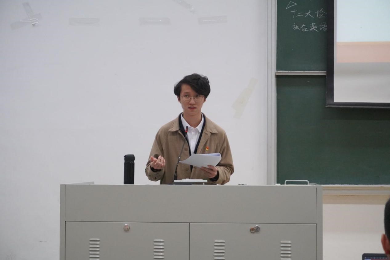 首先,潘天一学长就“四史”中的党史展开宣讲。他从学生的角度出发,以分享与交流的方式向全体新生介绍了如何学习、体会党史以及党史如何为我们的学习生活提供动力与指导。在介绍党史所包含的内容时,他将党自成立以来发生的大事件向同学们进行了梳理,并说到“党史是中国共产党的领导不断走向成熟的实践史。在此期间中国共产党经历过历史挫折,但是都能正视和解决实际的问题,使自己变得更正确更强大,从而成为中华民族伟大复兴的领导力量。”
