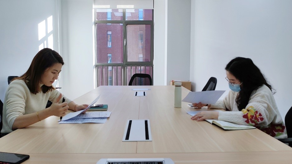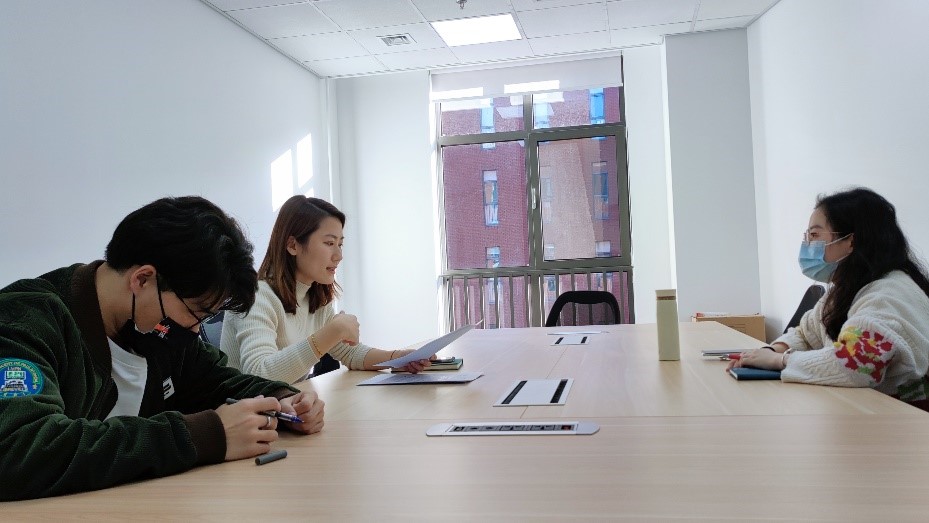 钱梦婷老师和张翊老师讨论简历修改细则,赵泽军同学做活动记录
