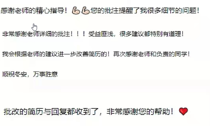 从简历整体上呈现的内容和形式来看,同学们都有着较为丰富的学习和实践经历,对简历的撰写和设计也有着初步的了解。但简历中也存在着一些共同的问题:比如简历模板不规范、板块界定不清晰、出现错别字以及内容上逻辑不通和详略失当等。评改结束之后,赵泽军和吴浩妮两位同学对批注后的简历进行了汇总与整理,并对同学们进行了“一对一”反馈。