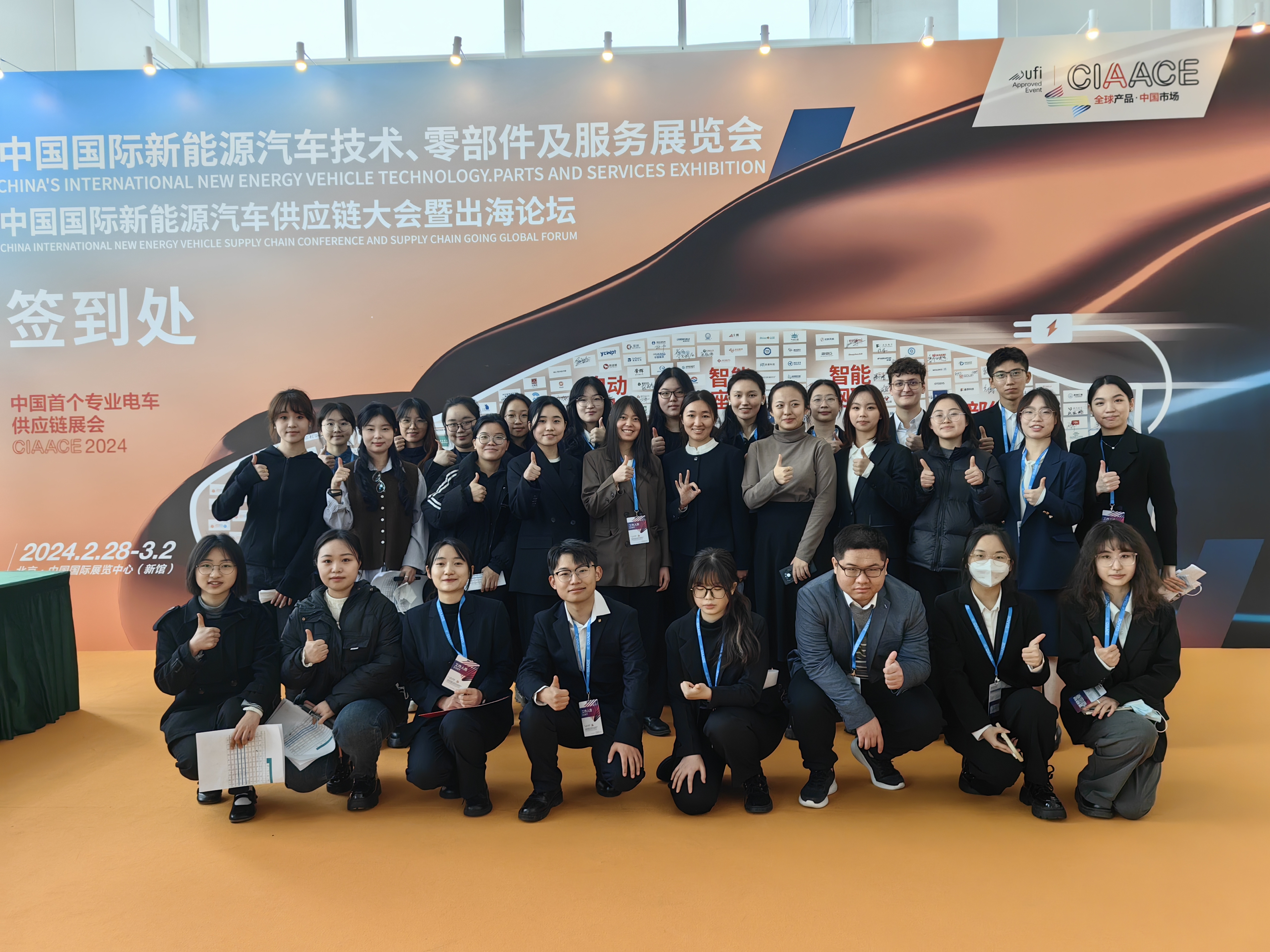 2024年2月28日,356体育在线官网33名学生志愿者赴北京顺义中国国际展览中心,参与第2届中国国际新能源汽车供应链大会志愿服务活动,在外宾接待、翻译陪同、引导服务等岗位上挥洒青春汗水。