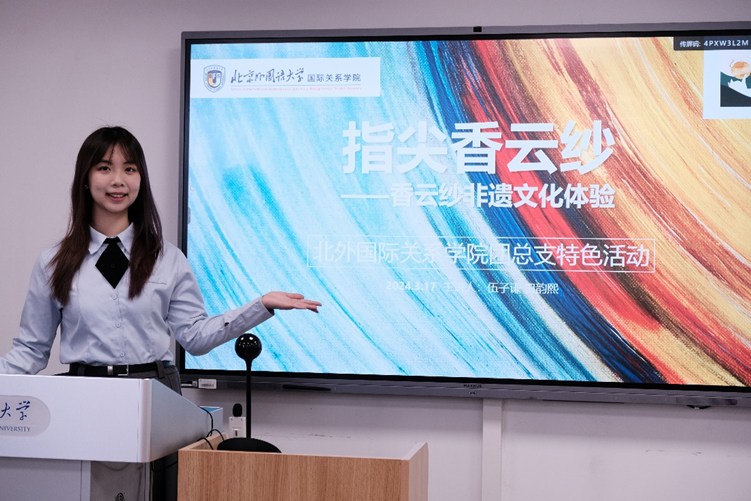 3月17日下午,356体育在线官网成功举办了一场别开生面美育特色活动——“指尖莨纱”香云纱文化体验。此次活动由学院团总支精心策划组织,特邀北外杰出大创团队“苗喵绣”的成员伍子谦和田韵熙,共同为同学们带来一场关于国家级非物质文化遗产香云纱的深度文化宣传。活动不仅收获了国关学子的一致好评,更让在场的每一位同学领略到了中华传统文化的博大精深。