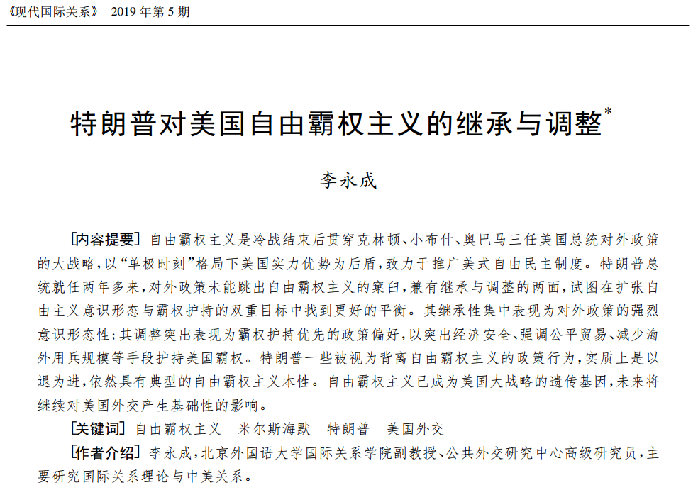 365best体育亚洲官网李永成副教授在CSSCI期刊《现代国际关系》2019年第5期发表论文《特朗普对美国自由霸权主义的继承与调整》,论文摘要和原文链接如下: